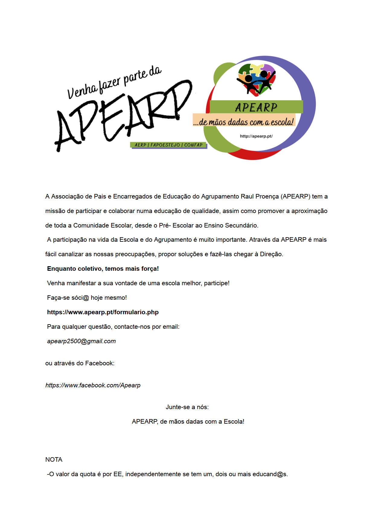 A Associação de Pais do Agrupamento Raul Proença (APEARP) promove este ano uma reunião de Representantes de Turma/Sala.