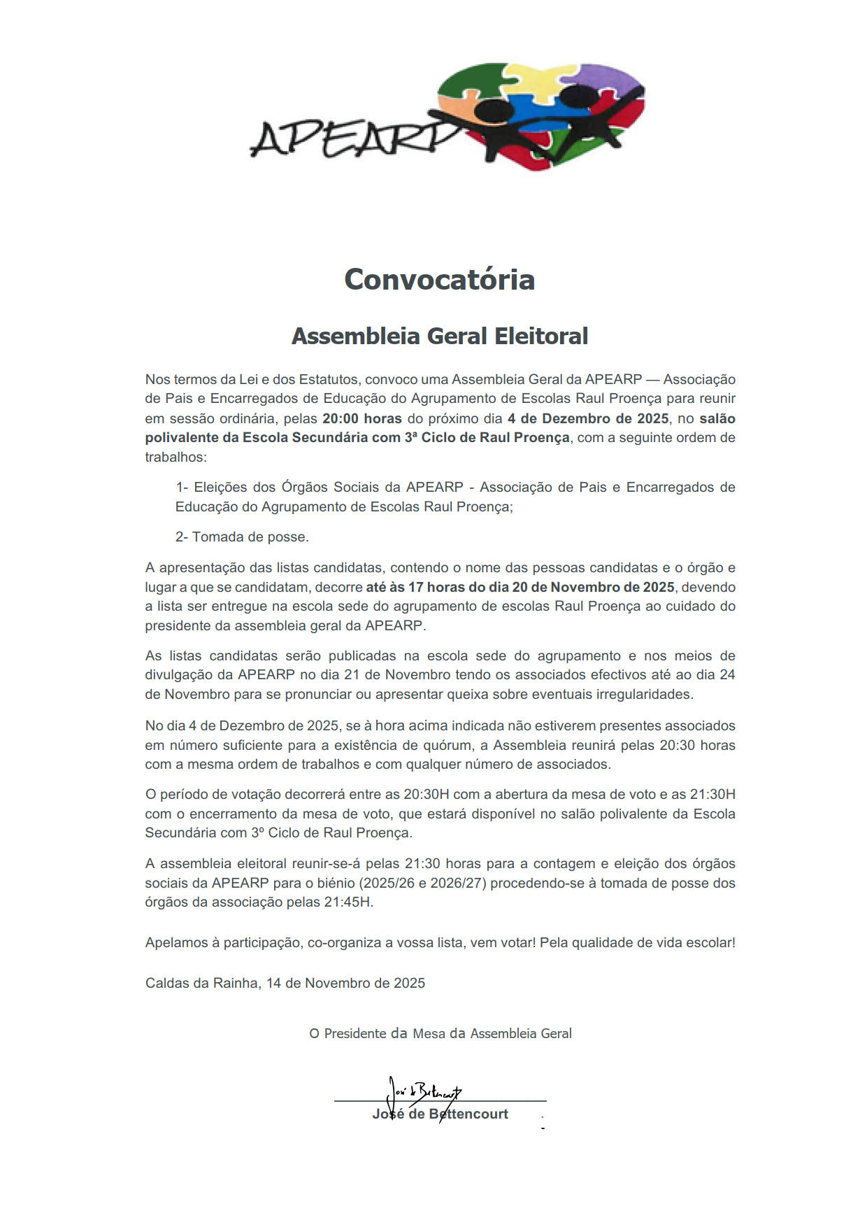 No dia 28 de outubro irá ocorrer a Assembleia Eleitoral para eleger a Direção da APEARP para os próximos 2 anos.